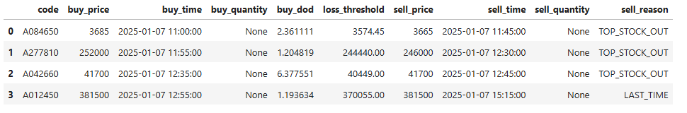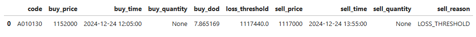 ![]() 묵직하게 손실. 그런데, 11:55 이후에는 의료기기, 방위산업으로 테마가 변경됨. 대장주가 바뀐 경우 외에도, top_theme, stock_list에 이전 주식이 없으면 매도하도록 변경을 해보자 - theme가 변경되어도 stock_list는 동일할 수 있다) |