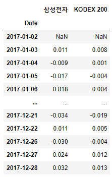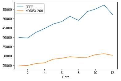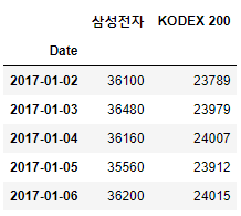 price_df.columns = ["삼성전자", "KODEX 200"]