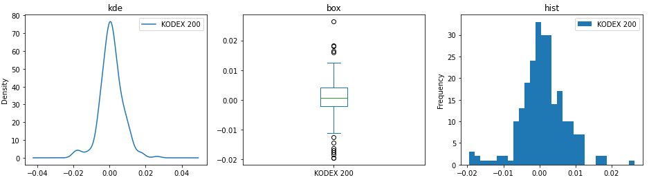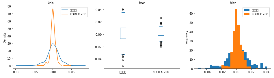 price_df.pct_change().plot(x="삼성전자", kind='box', ax=ax2, title='box');